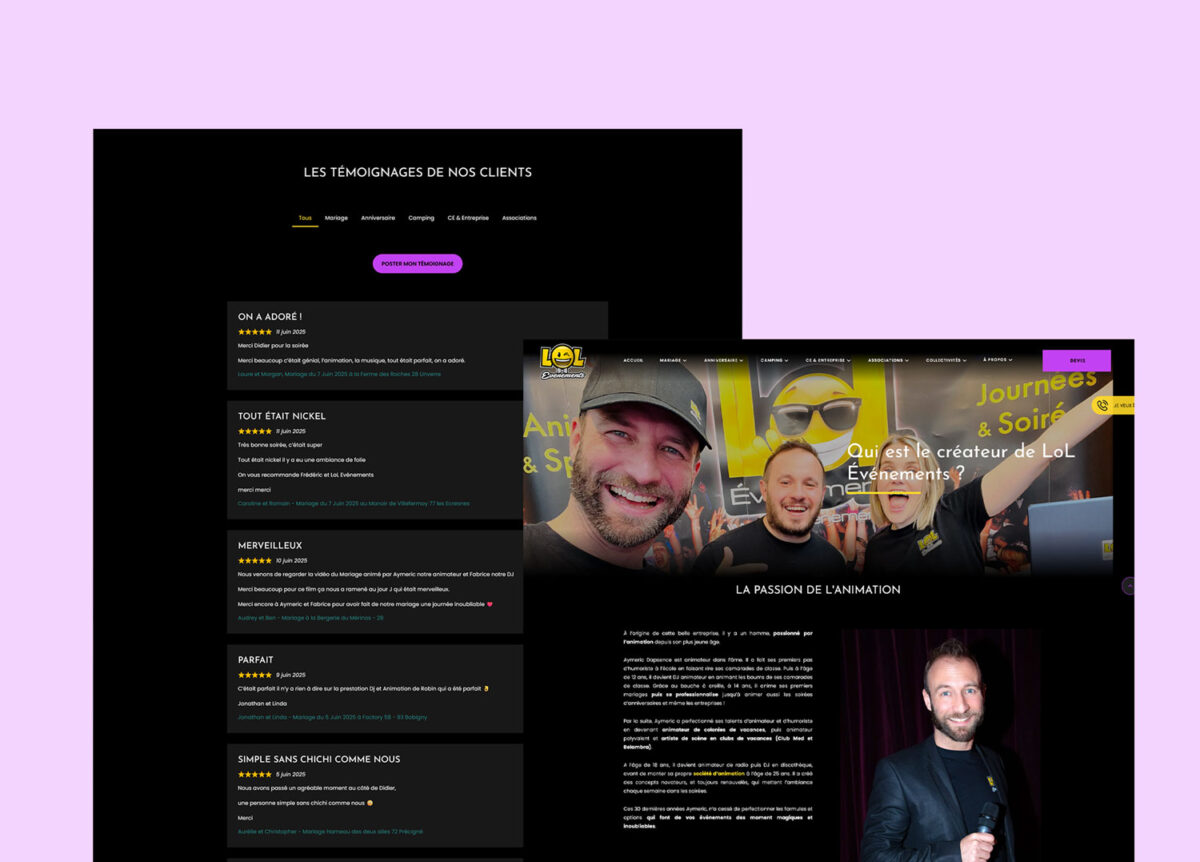 Le site LOL Événements a non seulement conservé ses excellents classements sur Google, mais a également gagné des places sur certaines requêtes grâce à l’ajout de contenu optimisé. La navigation plus intuitive et le design attractif renforcent l’engagement des visiteurs. Le site est maintenant un outil performant et moderne qui reflète parfaitement l’image festive et professionnelle de LOL Événements.